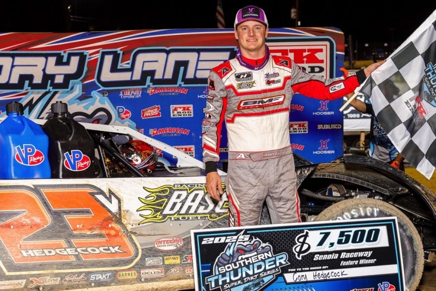 Senoia, Ga. (October 4, 2025) – Cory Hedgecock of Loudon, Tenn., continued his winning streak with the tour on Saturday night at Senoia (Ga.) as he drove to his third-straight victory with the Southern Thunder Super Dirt Series. Hedgecock pockets a $7,500 payday for his efforts in the Peach Blossom while Shane Clanton and Haiden Cowan make up the podium.